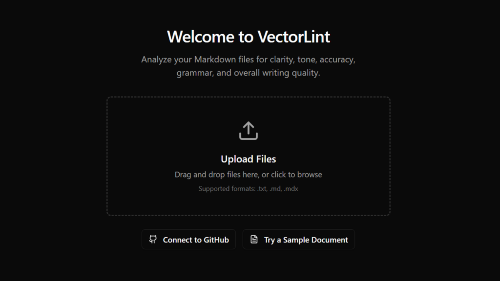 Sign up and start adding your markdown files immediately. You can upload from your device, paste content directly, or drag and drop. VectorLint accepts .md, .mdx, and .txt files.
