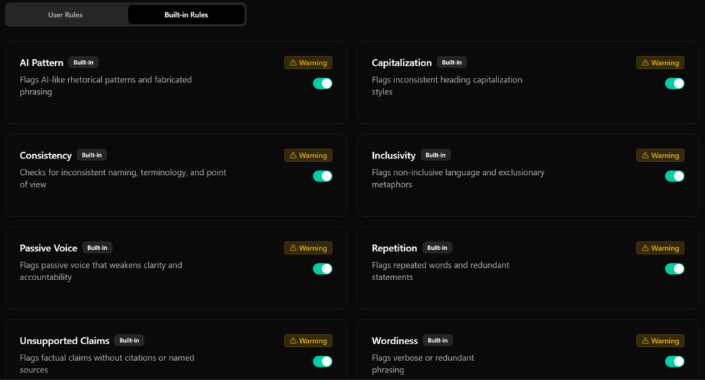 It uses LLM-as-a-Judge to evaluate content and catch quality issues, making it possible to catch issues like terminology and spelling errors that only require pattern matching, and also those that require contextual understanding, such as AI patterns, Search Engine Optimization (SEO) problems, and technical accuracy.