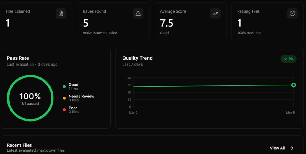 The Dashboard shows your documentation health at a glance. You’ll see your pass rate, divided into Good, Needs Review, and Poor, and a quality trend chart tracking your progress over the last week.