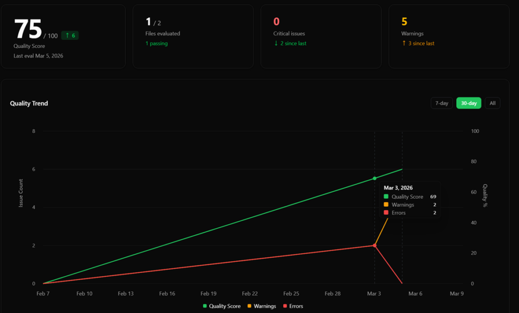 The Reports page is where you’ll find the big picture. It shows your documentation quality trend over time, with detailed stats for your quality score, the number of files evaluated, and issue counts.