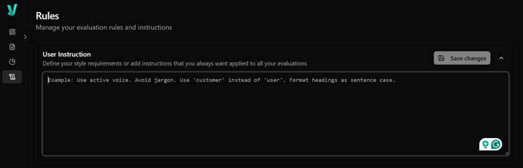 Your style instructions are a set of requirements you want applied to every evaluation, across all your files. You can have your full style guide here, or just the key preferences you want consistently enforced.